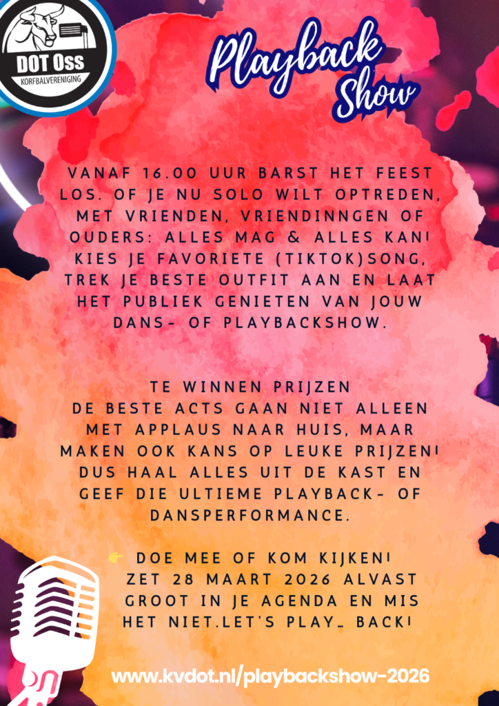 Op zaterdag 28 maart 2026 organiseren we een Playbackshow voor iedereen – jeugd én volwassenen zijn van harte welkom!